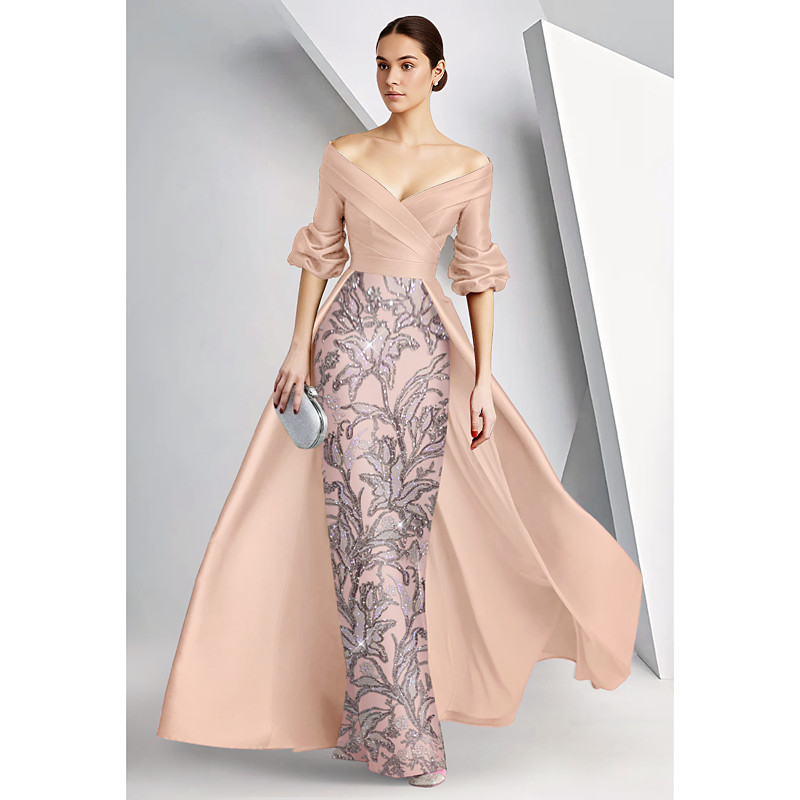 A-Line Sheath Column Floor Length Beaded Eembroidered Formal Dresses Mother of the Bride Dress Evening Gown Ball Gown with Overskirt Formal Dress Elegant Glittering 3/4 Length Sleeve Off Shoulder