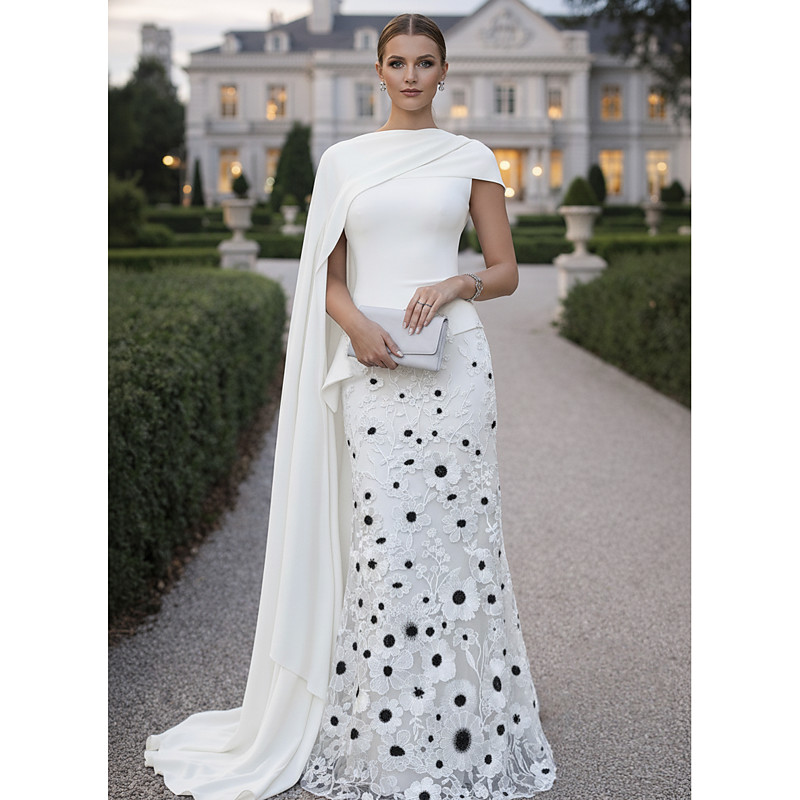 A-Line Sheath Column Floor Length Ball Gown with Cape Evening Gown Ball Gown Formal Dress Elegant Vintage Floral Short Sleeve Crew Neck Wedding Formal Stretch Fabric Cowl Back with Floral Print