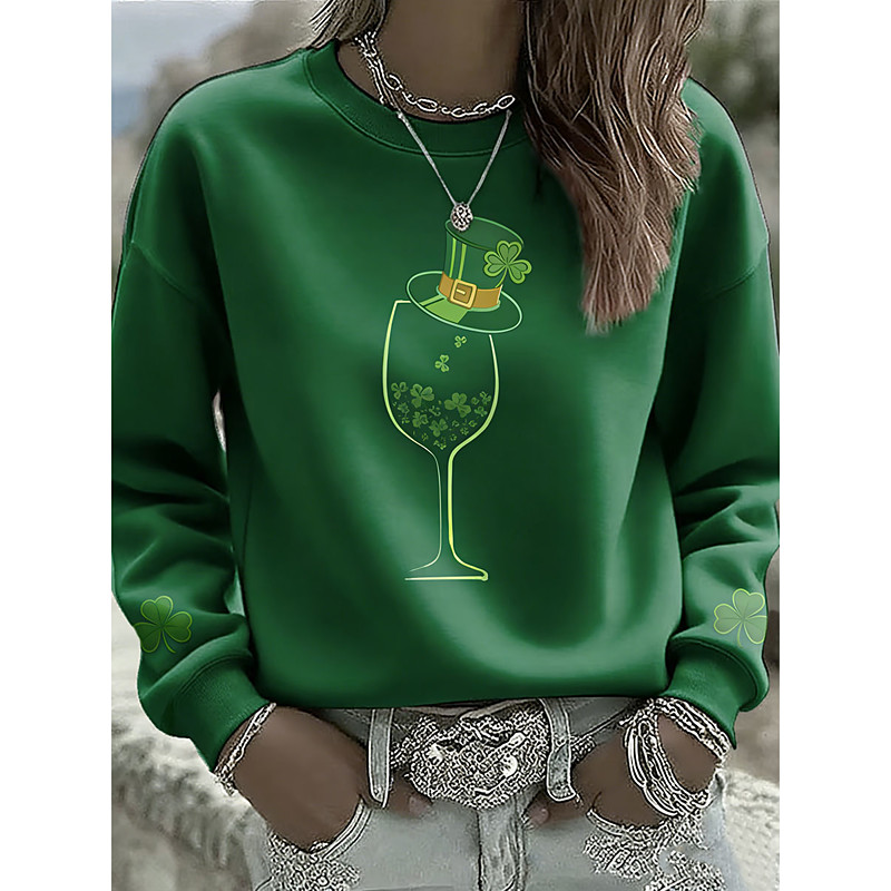 St. Patrick Women's Pullover Sweatshirt Graphic Shamrock Wine Glass Casual Long Sleeve Crew Neck Regular Tops Casual Street Dailywear Black White Green Fall Winter