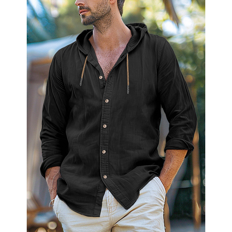 Men's Shirt Linen Shirt Plain Casual Daily Black White Blue Khaki Long Sleeve Hooded Spring Summer Clothing Apparel Buttons