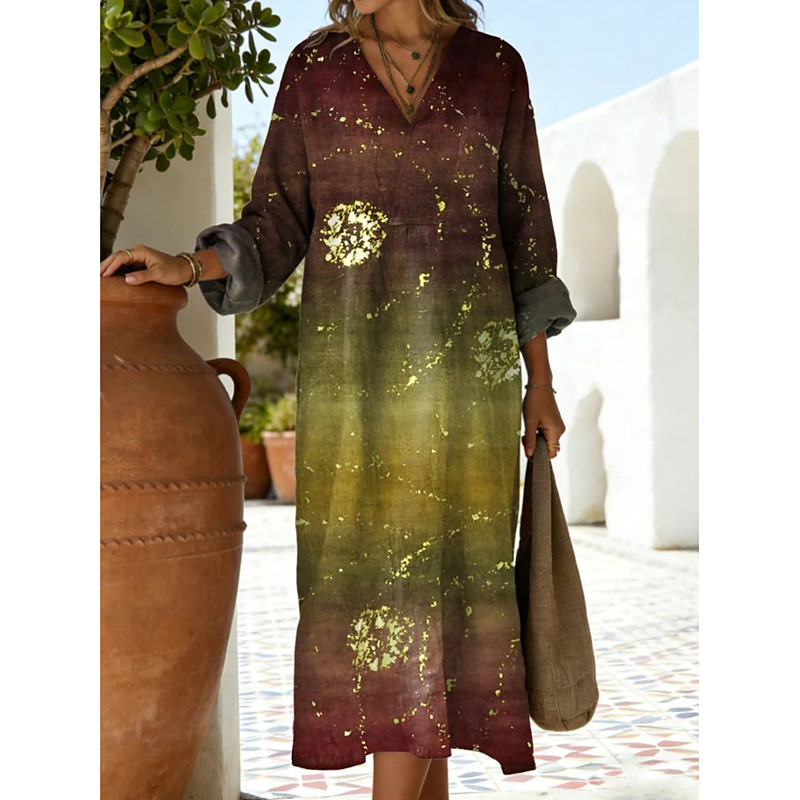 Women's Midi Dress Sundress Vacation Casual Beach Regular Fit Floral Graphic Long Sleeve V Neck Brown Green Summer Spring