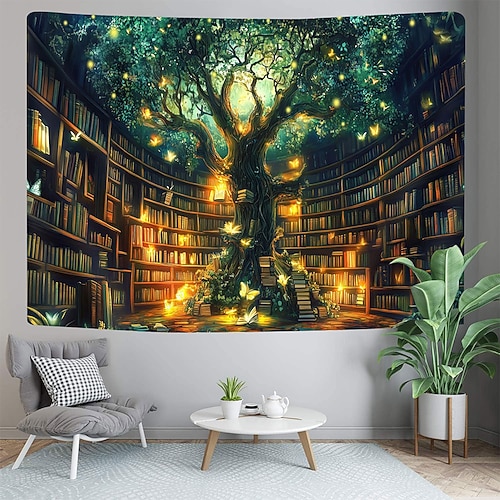 Arazzo da parete con foresta magica fantastica, albero gigante luminoso, lanterne, decorazione murale, fungo rosso, cascata, farfalle, paesaggio mistico, grande poster in tessuto per camera da letto,