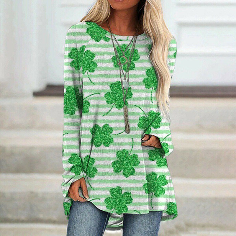 St. Paddy's Day St. Patrick's Day Women's T Shirt Leaf St. Patrick's Day Basic Long Sleeve Round Neck Long Tops Holiday Weekend Print Grass Green White Army Green Orange Green