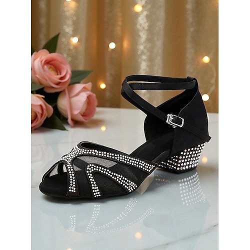 Scarpe da ballo da sala da donna con strass - tacchi latini aperti in rete con tacco basso a blocco, stile festa scintillante per salsa, tango eventi di danza formale