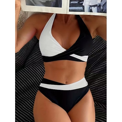 Women's Bikini 2 Piece Swimsuit Cheeky Slim Backless Vacation Beach Wear Graphic Color Block Halter Neck Sleeveless Bathing Suits