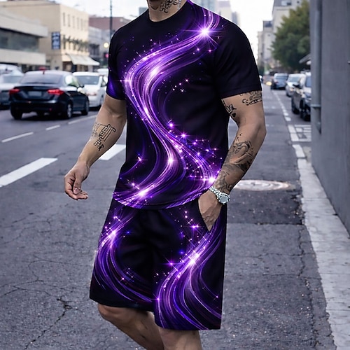 Herren Geometrisch Linie 2St T-Shirts-Sets Sommeroberteile Kurzarm Kurze Hosen Rundhalsausschnitt Sport Alltagstauglich Lässig Outdoor Urlaub Ausgehen 3D-Druck Sommer Blau Schwarz Rote