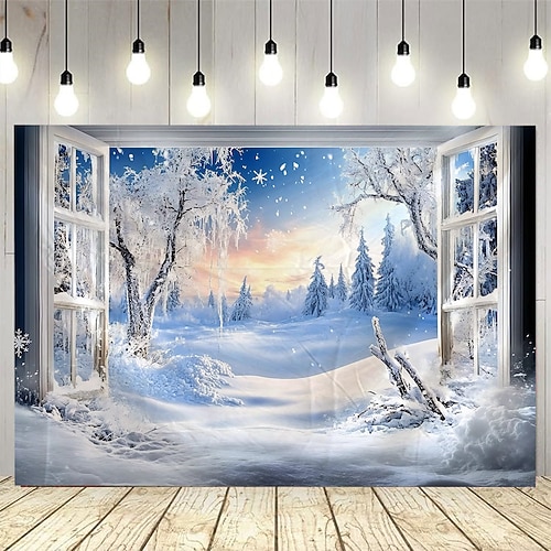 arazzo con motivo di finestra con paesaggio innevato, grande decorazione murale da appendere alla parete, tessuto per sfondo fotografico, arredamento per la casa per camera da letto, soggiorno o