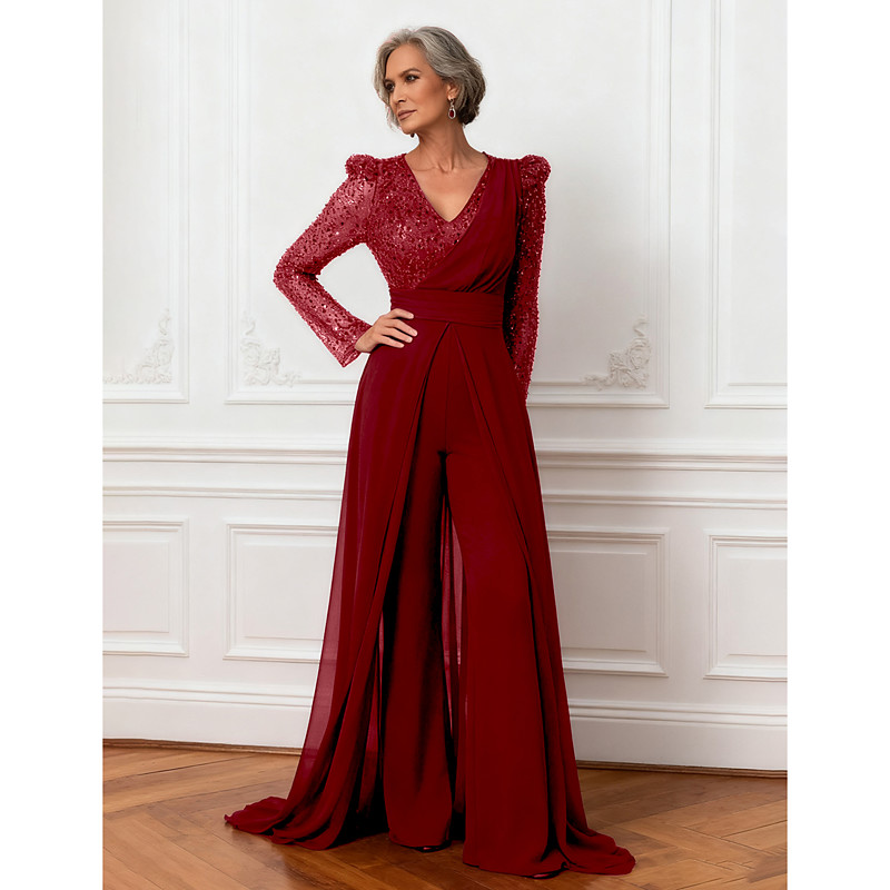 Jumpsuits Floor Length Mother of the Bride Dress Long Sleeve V Neck Elegant Sparkle Shine Formal Wedding Guest Wedding Party Chiffon with Sash / Ribbon Sequin