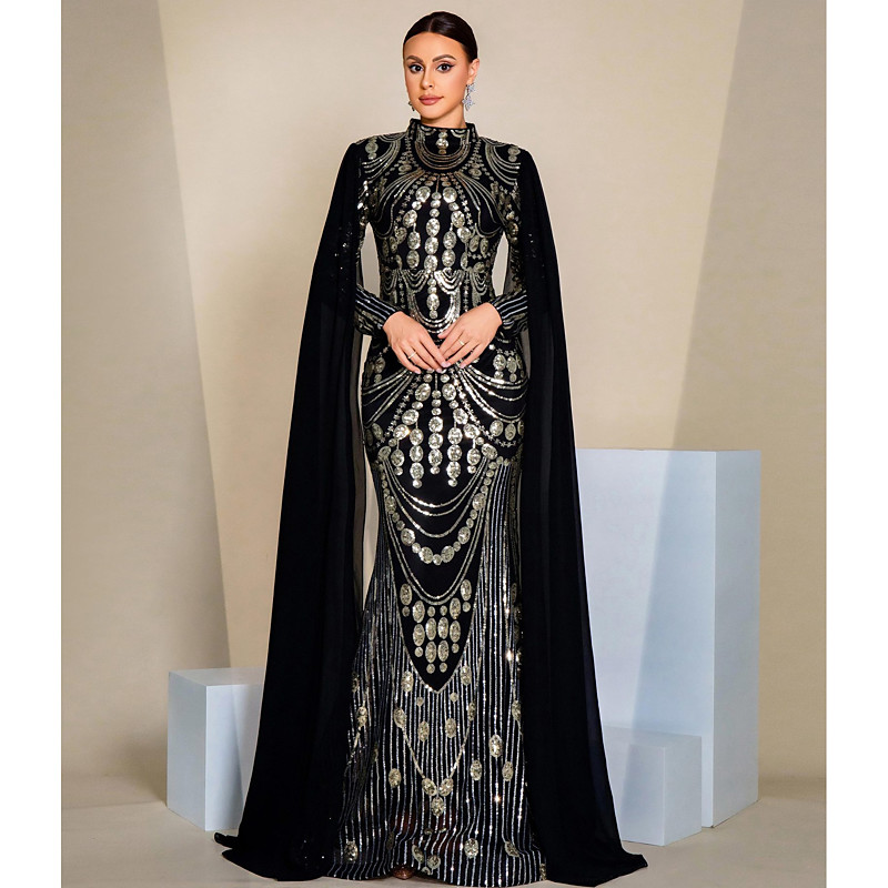 Sheath Column Floor Length Beaded Eembroidered Formal Dresses Mother of the Bride Dress Ball Gown with Cape Evening Gown Formal Dress Elegant Sparkle Sleeveless High Neck Evening Party Wedding Tulle