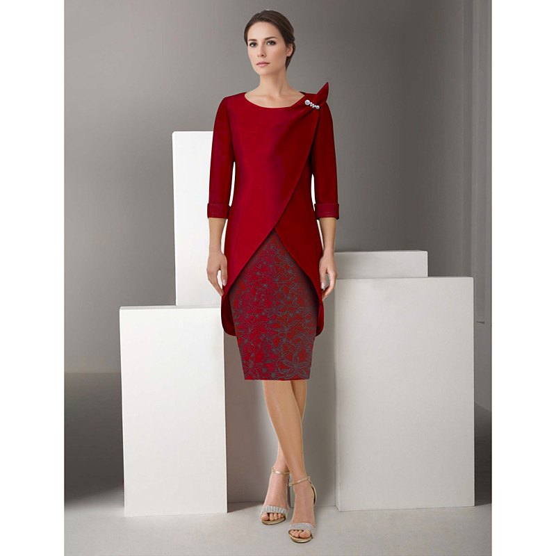 Two Piece Sheath Column Dress Sets Knee Length Wedding Guest Dress Mother of the Bride Dress 3/4 Length Sleeve V Neck Elegant Vintage Sparkle Shine Wedding Party Semi Formal Satin Glitter Lace with
