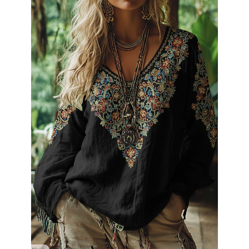 Women's Boho T-shirt T Shirt Tee Top Floral Plants Vintage Ethnic Casual Long Sleeve V Neck Regular Tops Daily Weekend Vacation Wear Print Blue Black Spring Fall
