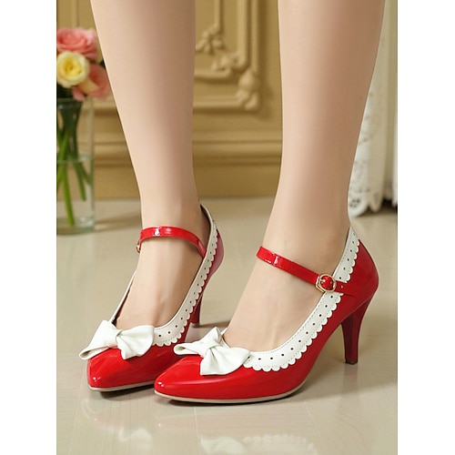 scarpe mary jane in vernice bianche e nere da donna – eleganti décolleté a punta anni '50 con bordo smerlato e fiocco per ufficio, feste e occasioni speciali