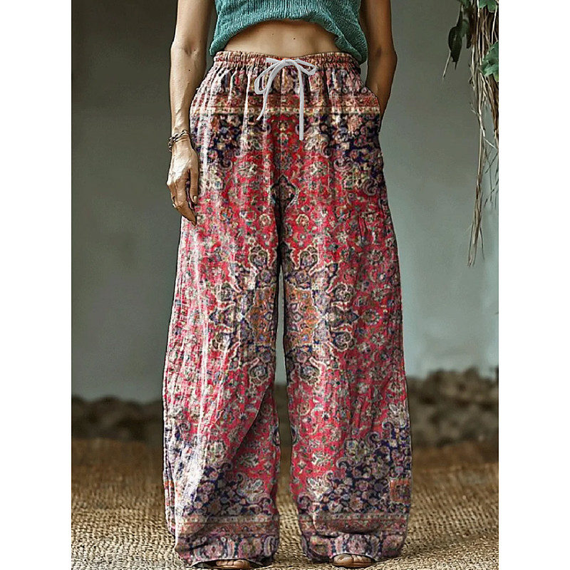 Women's Wide Leg Chinos Baggy Pants Vacation Fashion Ethnic Style Full Length High Waist Floral Graphic Abstract Printing Soft Breathable Micro-elastic Formal Vacation Street White Yellow Pink Blue