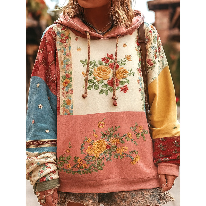 Women's 3D Print Vintage Boho Hoodie Patchwork Hoodie Sweatshirt Floral Pullover Sweatshirt Elegant Warm Active Hooded Street Dailywear Patchwork Print Yellow Light Green Pink Spring Fall Winter
