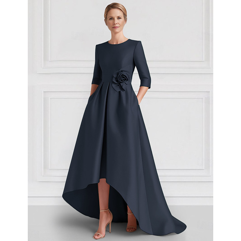 A-Line Asymmetrical Floor Length Evening Gown Ball Gown Formal Dress Elegant Silky Half Sleeve Crew Neck Wedding Formal Champagne Mother Of the Bride Dress Stretch Satin with Pocket