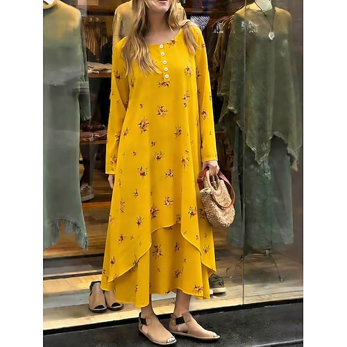 Per donna Abito Midi Abito a Tubino Abito a trapezio Casual Ferie Vestibilità comoda Floreale Grafico Manica Lunga Girocollo Bianco Giallo Marrone Verde Estate Primavera Autunno Inverno