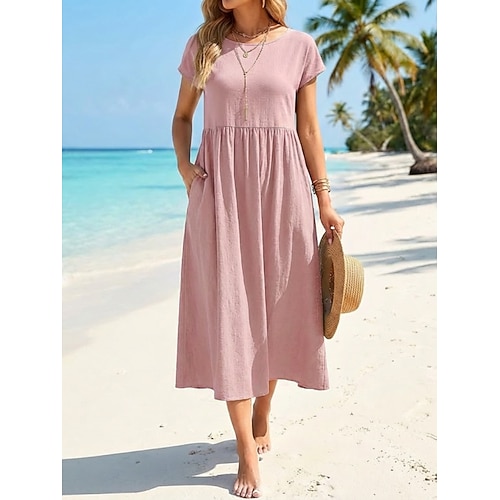 Per donna Abito Midi Finto cotone e lino Abito a Tubino Moda Moderno All'aperto Spiaggia Vacanza Vestibilità comoda Semplice Manica Corta Girocollo Nero Bianco Verde chiaro Rosa Estate Primavera
