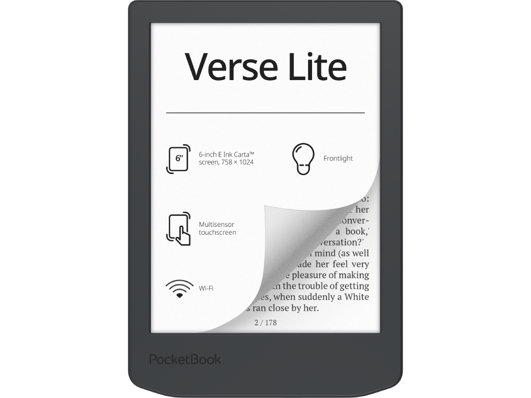 PocketBook Verse Lite, 15,2 cm (6), E Ink Carta, 758 x 1024 pikseliä, ACSM, AZW, AZW3, CBR, CBZ, CHM, DOC, DOCX, DjVu, EPUB, FB2, FB2.ZIP, HTM, HTML, MOBI, PDF, PRC,..., BMP, JPEG, PNG, TIFF, 8 GB, 8 GB