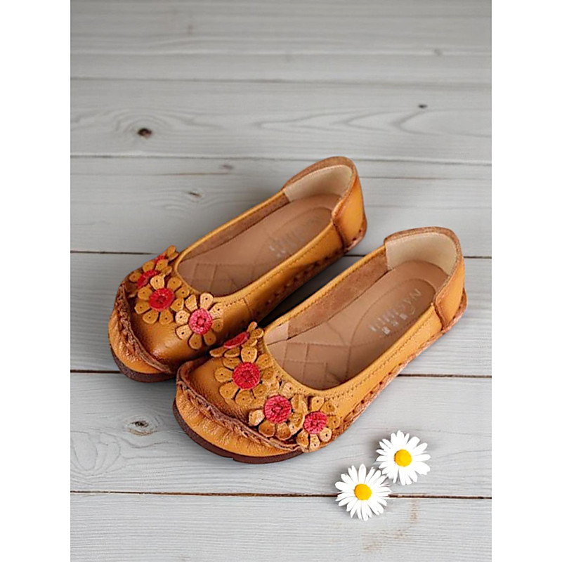 Women's Premium Leather Flats with Floral and Ruffled Design – Retro Comfortable Style for Spring Garden Walks, Weekend Brunch Daily Errands