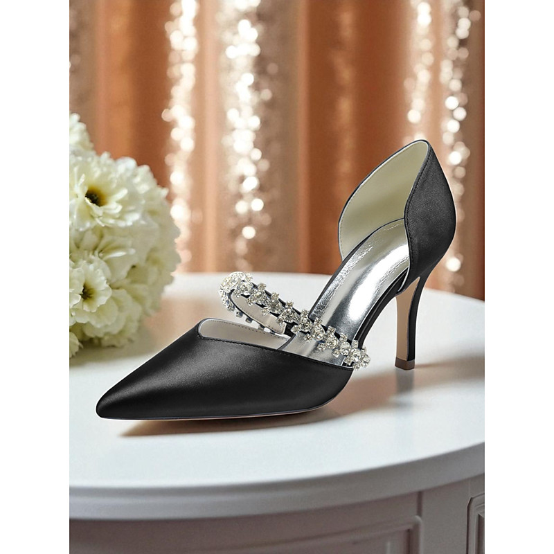 Women's Silver Satin Pointed-Toe Wedding Heels – Rhinestone Embellished Ankle Strap and Elegant Mid Heel