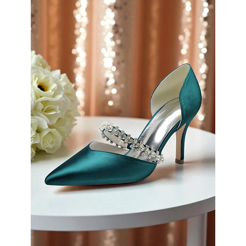 Women's Teal Satin Stiletto Heels with Crystal Strap - Elegant Pointed Toe Pumps for Formal Occasions and Cocktail Parties