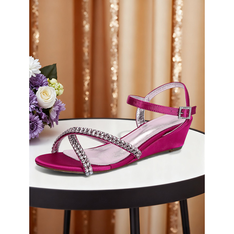 Women's Blue Rhinestone Wedge Sandals - Elegant Open Toe Ankle Strap Heels for Party and Evening Events