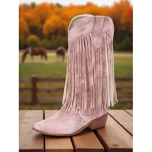stivali da cowboy da donna in similpelle marrone con frange – stivali western ricamati a metà polpaccio con punta quadrata e tacco basso, stile boho country per rodei, festival musicali e outfit autunnali e invernali