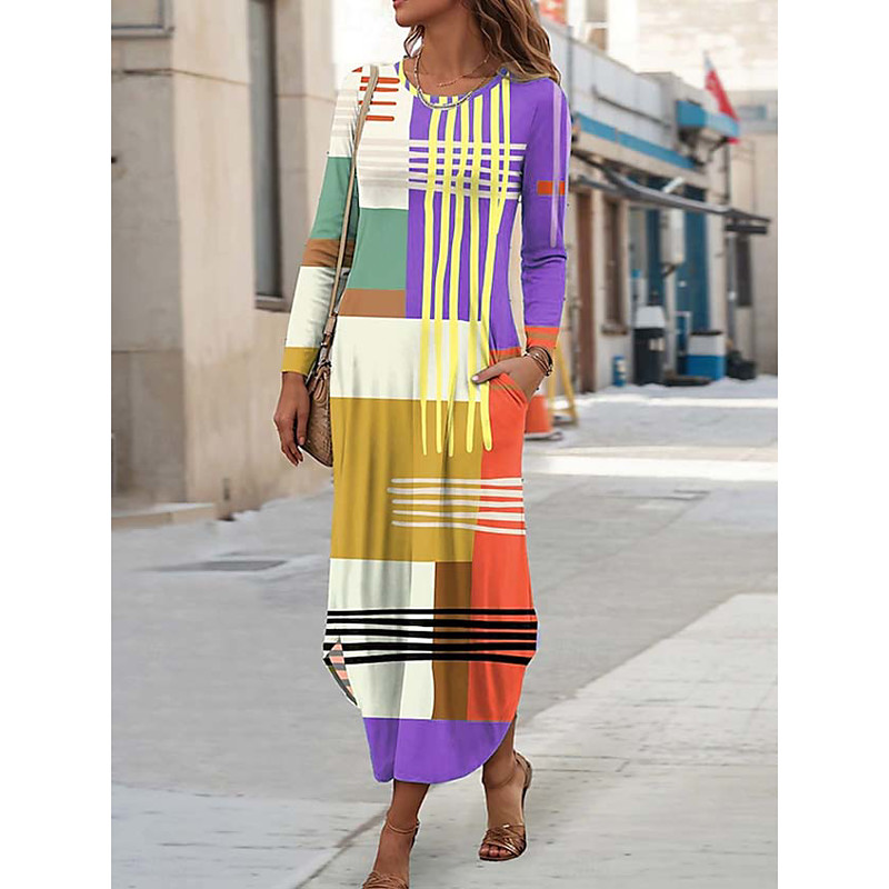 Women's Midi Dress Sheath Dress T Shirt Dress Tee Dress Vacation Casual Boho Holiday Date Regular Fit Graphic Geometric Abstract Long Sleeve Crew Neck Yellow Pink Blue Purple Spring Fall Winter Autumn