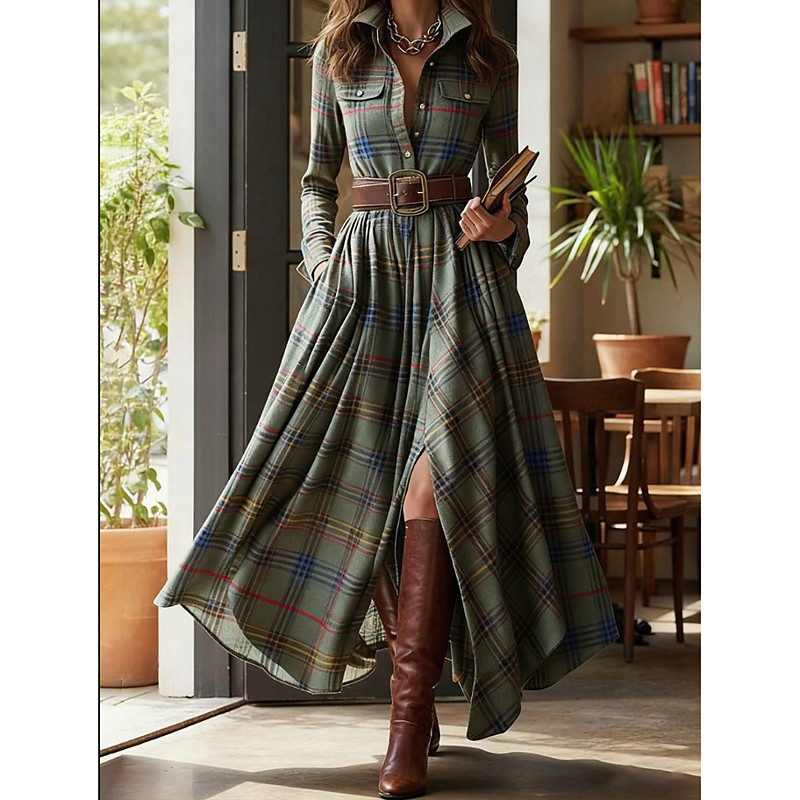 Women's Midi Dress Shift Dress Vacation Casual Boho Daily Regular Fit Plaid Long Sleeve Shirt Collar ArmyGreen Spring Fall Winter