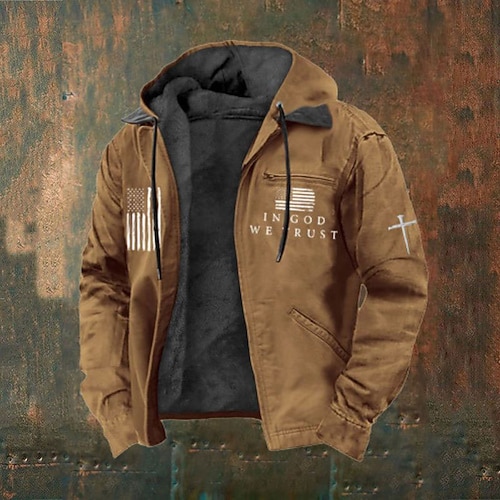 Per uomo Felpa con cappuccio a zip intera Giacca in Pile Felpa con cappuccio in pile Nero Marrone Grigio scuro Con Cappuccio Lettera Croce Bandiera Americana Cerniera Tasca Casuale Quotidiano Uscire