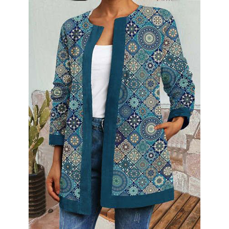 Women's Casual Lightweight Coat Open Front Work Print Geometric Comfortable Boho Vintage Regular Fit Long Sleeve With Pocket Outerwear Long Sleeve Fall Lake blue S