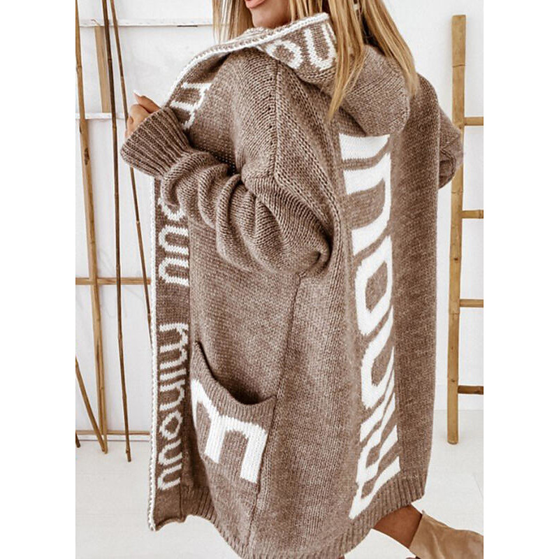 Women's Sweater Cardigan Elegant Fashion Streetwear Letter Open Front Pocket Knitted Print Long Sleeve Long Tops Knit Outdoor Daily Weekend Brown Beige Spring Fall