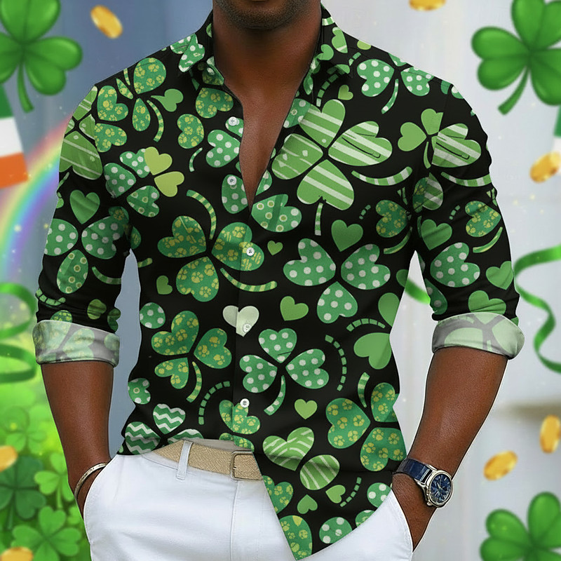 St. Patrick's Day Shirt for Men - Lucky Clover Shamrock 3D Print Long Sleeve Top with Lapel Collar Irish Graphic St. Paddy's Day Top