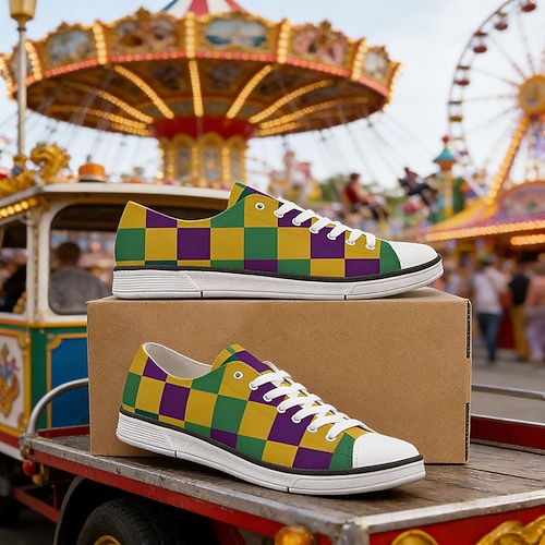 Damen-Sneaker aus Canvas mit Mardi-Gras-Konfetti-Print und Schnürung – stylische und bequeme Freizeitschuhe für Karnevalsumzüge, Ausflüge in den Vergnügungspark, Straßenfeste und sommerliche Alltagsbeschäftigungen