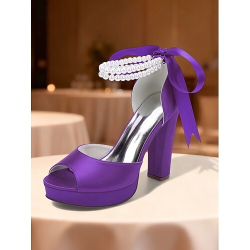 sandali da donna con tacco alto, plateau e cinturino alla caviglia con perle, in raso viola - scarpe da festa glamour con punta aperta, per serate, matrimoni e cocktail