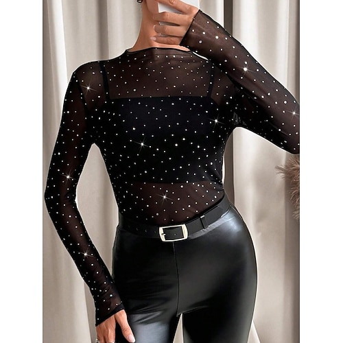 Per donna Blusa Tinta unica Elegante Casual Manica Lunga Collo Alto Top Regolari Quotidiano Patchwork Rete Nero Primavera Autunno Inverno