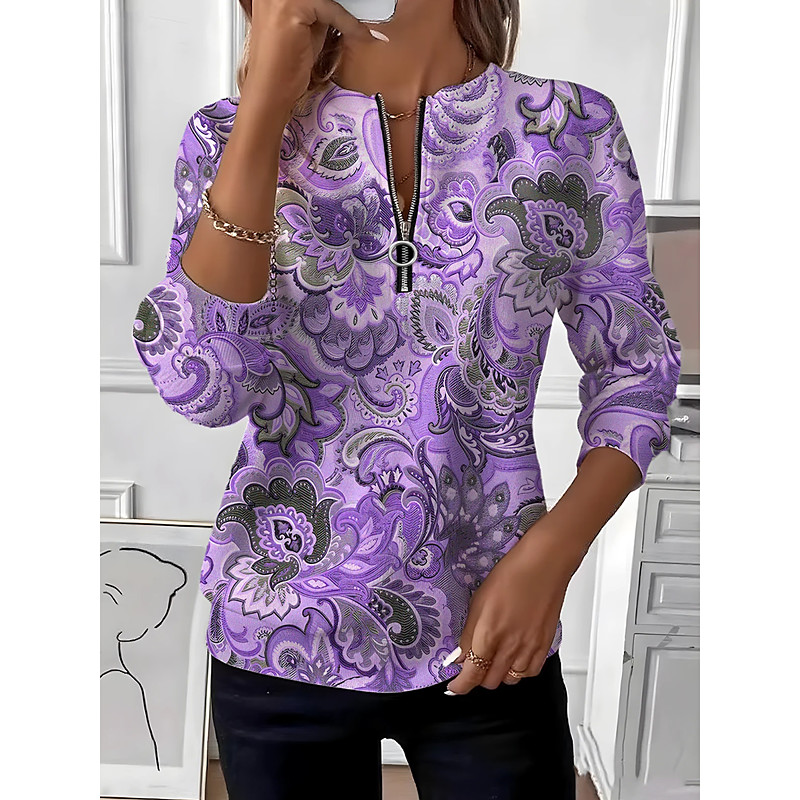 Women's Sweatshirts Graphic Paisley Fashion Casual Long Sleeve Crew Neck Regular Tops Street Dailywear Zipper Print Purple Khaki Fall Winter