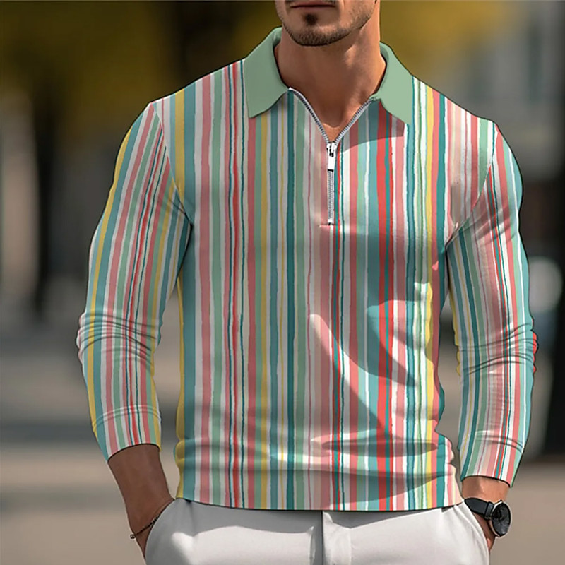 Men's Vertical Stripes Polo Long Sleeve Turndown Modern Leisure Sports Outdoor Athleisure Casual Daily Zipper 3D Print Spring Fall Winter Black Brown Green