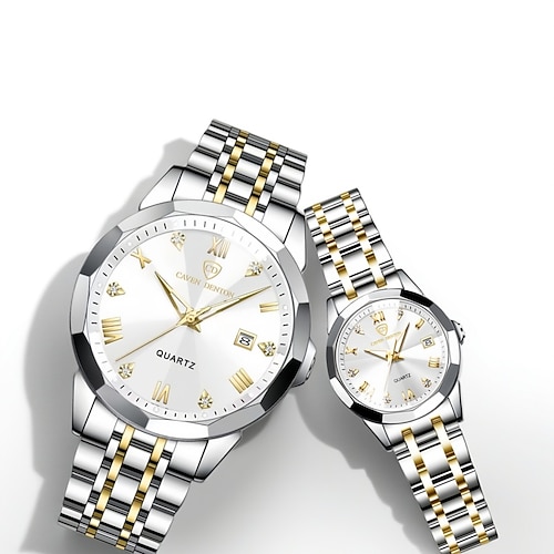 Due Quadranti Romani Rotondi Decorati con Diamanti d'Acqua Display Luminosa Orologio Coppia IPX7 Impermeabile Orologio al Quarzo Calendario Data Moderna Orologio da Business con Cinturino in Acciaio