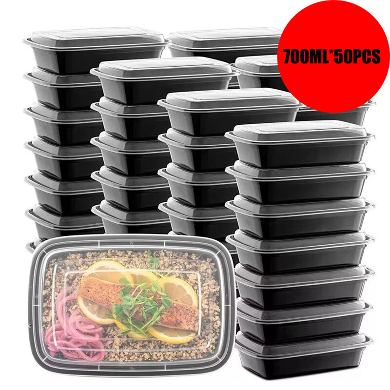 Boîtes Repas Jetables avec Couvercle, Contenants de Préparation de Repas Réutilisables, Noires, Rectangulaires, 700 ml, Lot de 50