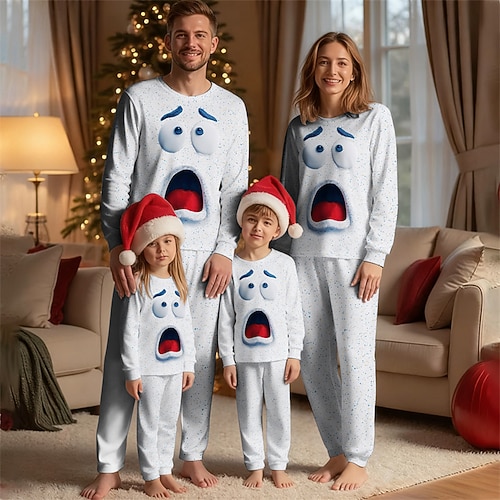 Familie Weihnachten Weihnachtspyjama für die Familie Schlafanzug Familiensets Grafik Cartoon Heim Druck Weiß Langarm Täglich Passende Outfits