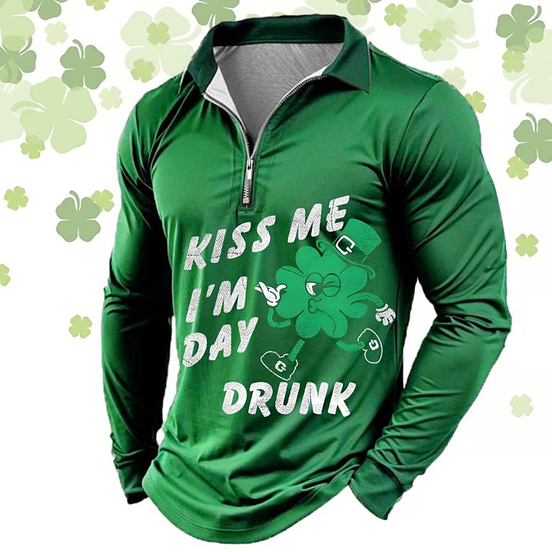 St Patrick's Day Men's Shamrock Text Zip Polo Shirts Long Sleeve Polo Shirts Lapel Casual Outdoor Festival Outfit 3D Print Spring Fall Black Light Green Green