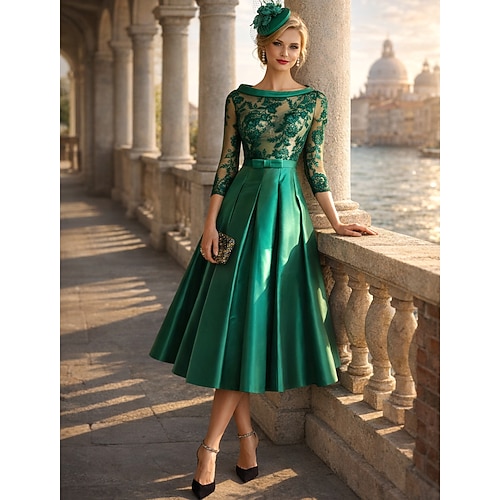 Linea ad A Lunghezza Tè Vestito da Festa Abito da Cocktail Abito da invitata a nozze Abito da cerimonia per signora Manica 3/4 Girocollo Elegante Ospite di nozze Festa di fidanzamento Chiffon Pizzo