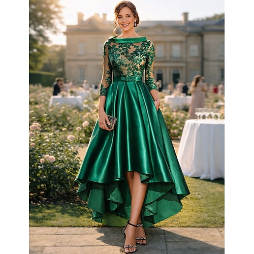 Linea ad A Asimmetrico Vestito da Festa Abito da Cocktail Abito da invitata a nozze Abito da cerimonia per signora Manica 3/4 Collo gioiello Elegante Alto Basso Madre Formale Raso con Pieghe