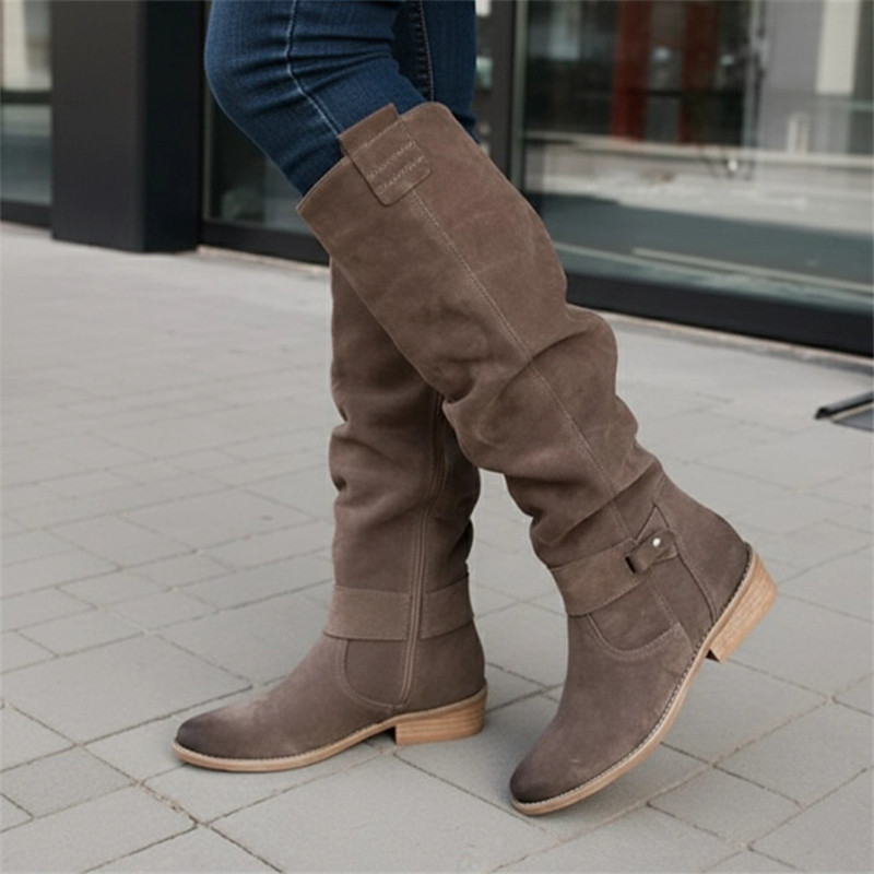 Women's Slouchy Suede Knee-High Boots with Buckle - Casual Flat Heel for Everyday Fall Fashion