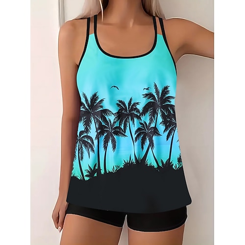 Costume da bagno a due pezzi Tankini da donna con gambe a boy controllo della pancia vita alta slim senza schienale per vacanze al mare grafica floreale scollo a U senza maniche