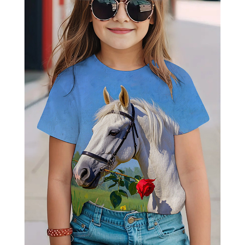 Girls' 3D Horse T shirt Tee Short Sleeve Summer Spring Fashion Basic Kids 4-12 Years Crew Neck Outdoor Casual Daily Regular Fit
