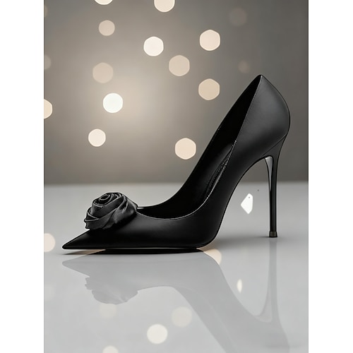 décolleté a punta con tacco a spillo da donna decorate con rose nere - eleganti tacchi alti con fiori in raso per la vigilia di Capodanno cocktail party