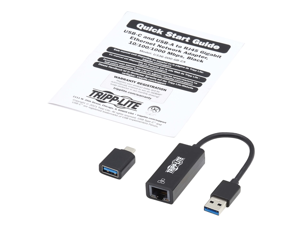 Eaton Tripp Lite Series USB-C, USB-A to RJ45 Gigabit Ethernet Network Adapter (2xM/F), USB 3.2 Gen 1, Black - Netværksadapter - USB-C 3.2 Gen 1 / Thunderbolt 3 - Gigabit Ethernet x 1 - sort
