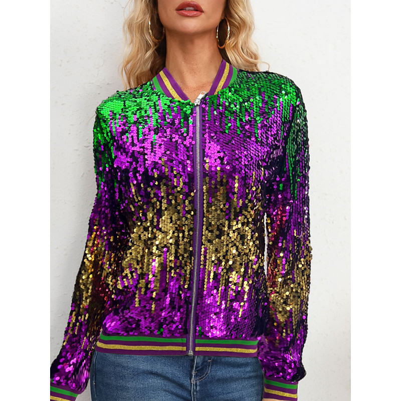 Carnival Women's Bomber Jacket Casual Jacket Comfortable Breathable Zipper Sequin Casual Color Block Casual Vacation Party Zipper Short Stand Collar Regular Fit Long Sleeve Outerwear Deep Purple